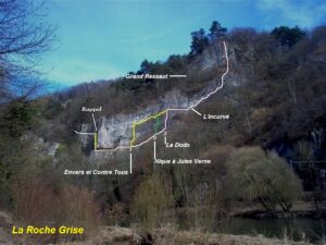 Rocher Grise is een relatief klein maar technisch uitdagend klimmassief in België met 44 routes in de moeilijkheidsgraad 5a tot 6a. Het gebied is semi-geëquipeerd, wat betekent dat vaste haken aanwezig zijn, maar het meenemen van extra zekermateriaal zoals klemblokken en friends sterk wordt aanbevolen. Dit maakt het massief geschikt voor klimmers die ervaring hebben met zelf zekeren en het plaatsen van eigen bescherming.