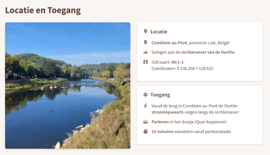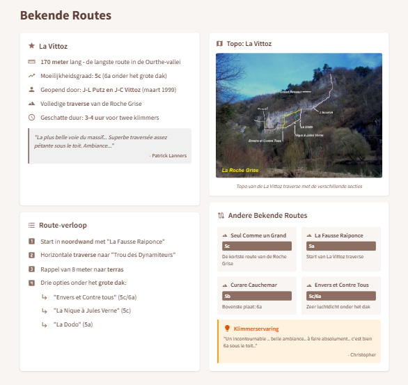 Rocher Grise biedt 44 routes (5a–6a) op een 35 meter hoog kalkmassief. Semi-geëquipeerd, eigen zekermateriaal aanbevolen. Rustige locatie aan de Ourthe.
