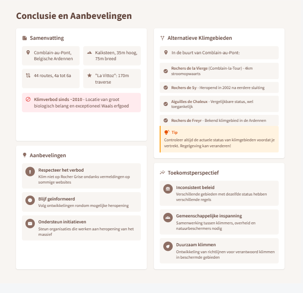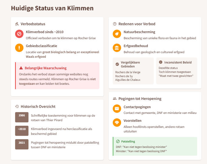 Rocher Grise ligt nabij Comblain-au-Pont aan de Ourthe en is een kalkmassief van ongeveer 35 meter hoog en 75 meter breed. Het gebied telt circa 44 routes, met moeilijkheidsgraden van 5a tot 6a. Het massief is semi-geëquipeerd: vaste haken zijn aanwezig, maar het meenemen van eigen zekermateriaal zoals klemblokken en friends is sterk aanbevolen. Dit maakt het massief geschikt voor klimmers die ervaring hebben met zelf zekeren en technisch klimmen.
