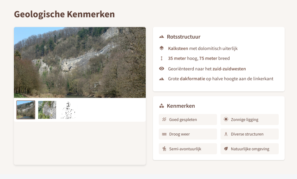 Rocher Grise is een uitdagend semi-geëquipeerd kalkmassief voor klimmers die ervaring hebben met zelf zekeren en technisch klimmen waarderen, gelegen in een rustige omgeving aan de Ourthe.