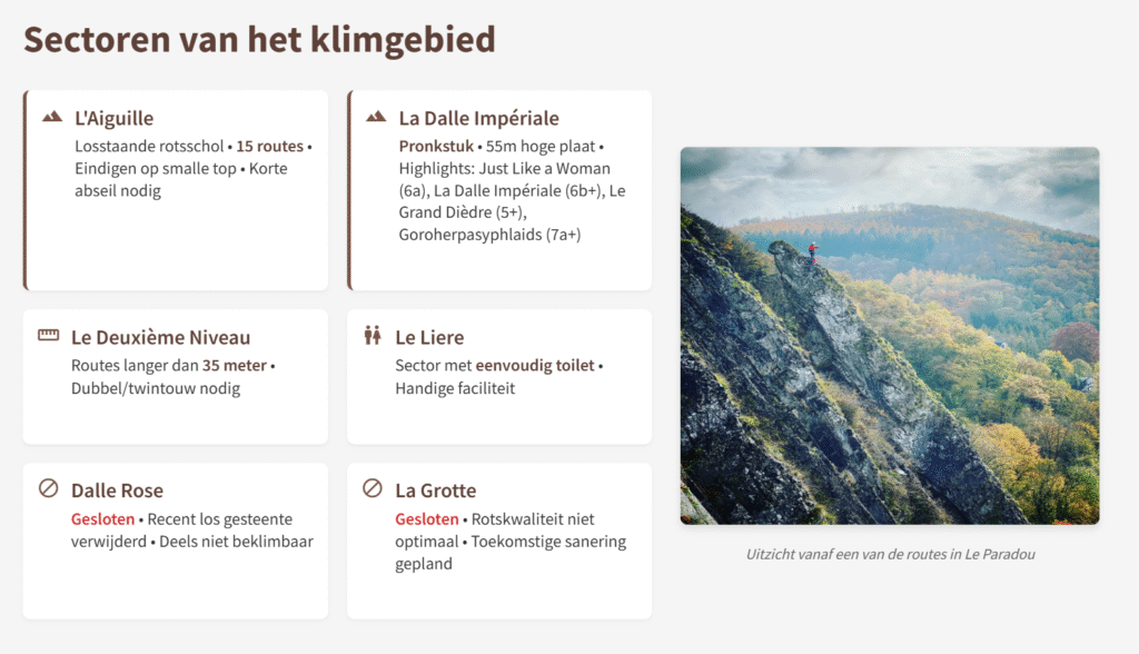 - Dalle Impériale: De 55 meter hoge plaat herbergt routes als “Just Like a Woman” (6a) en “La Dalle Impériale” (6b+), waarbij doorlopende klimlijnen de nadruk leggen op voettechniek.