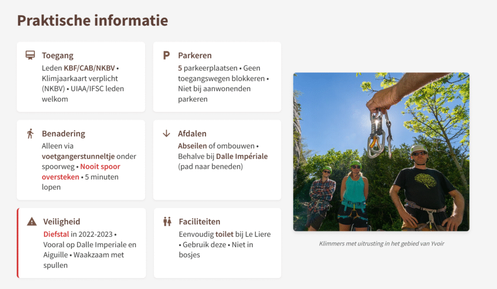 - Toegangseis: Lidmaatschap van KBF, NKBV of een UIAA-aangesloten federatie, plus klimjaarkaart voor Nederlanders.